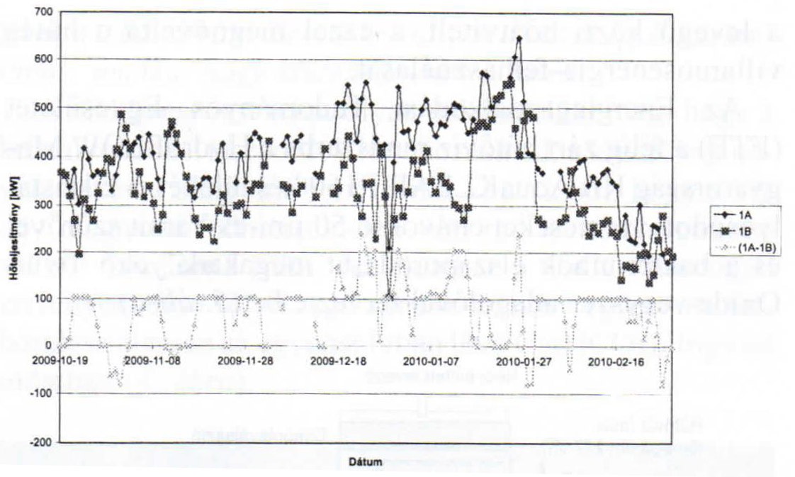 Поскольку целью работы было проанализировать долговременные изменения теплопередачи, мы создали из почасового графика график среднесуточных температур, и далее использовали его в последующих расчетах. Изменения среднесуточной температуры исходной воды находились в пределах 1ºC, поэтому мы решили считать её условно постоянной. На рисунке ниже приведены значения теплопередачи по двум маслоохладителям (тёмного цвета) и разница между их значениями (светлая кривая). С системой Гидрофлоу Акваклер теплопередача, а значит и эффективность охлаждения, возросла не менее чем на 25%.