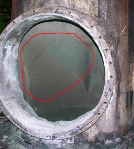 Толщина слоя накипи в корпусе вакуум-выпарного аппарата: крупный план.